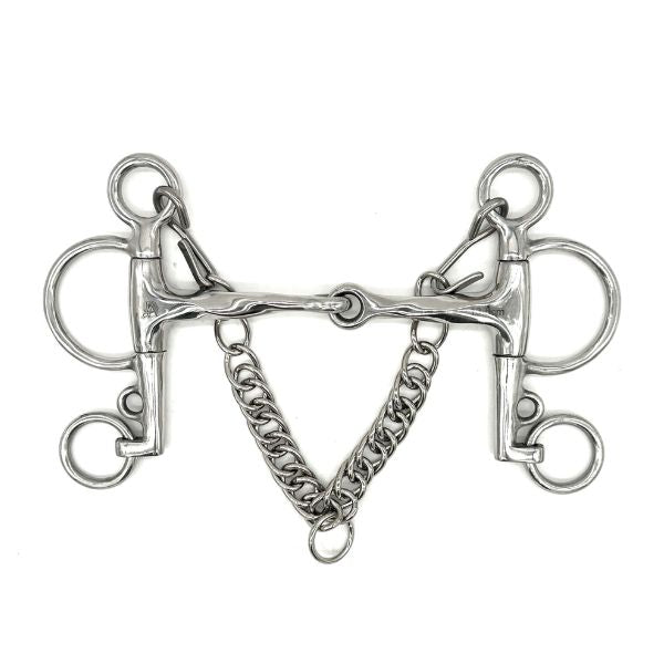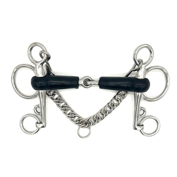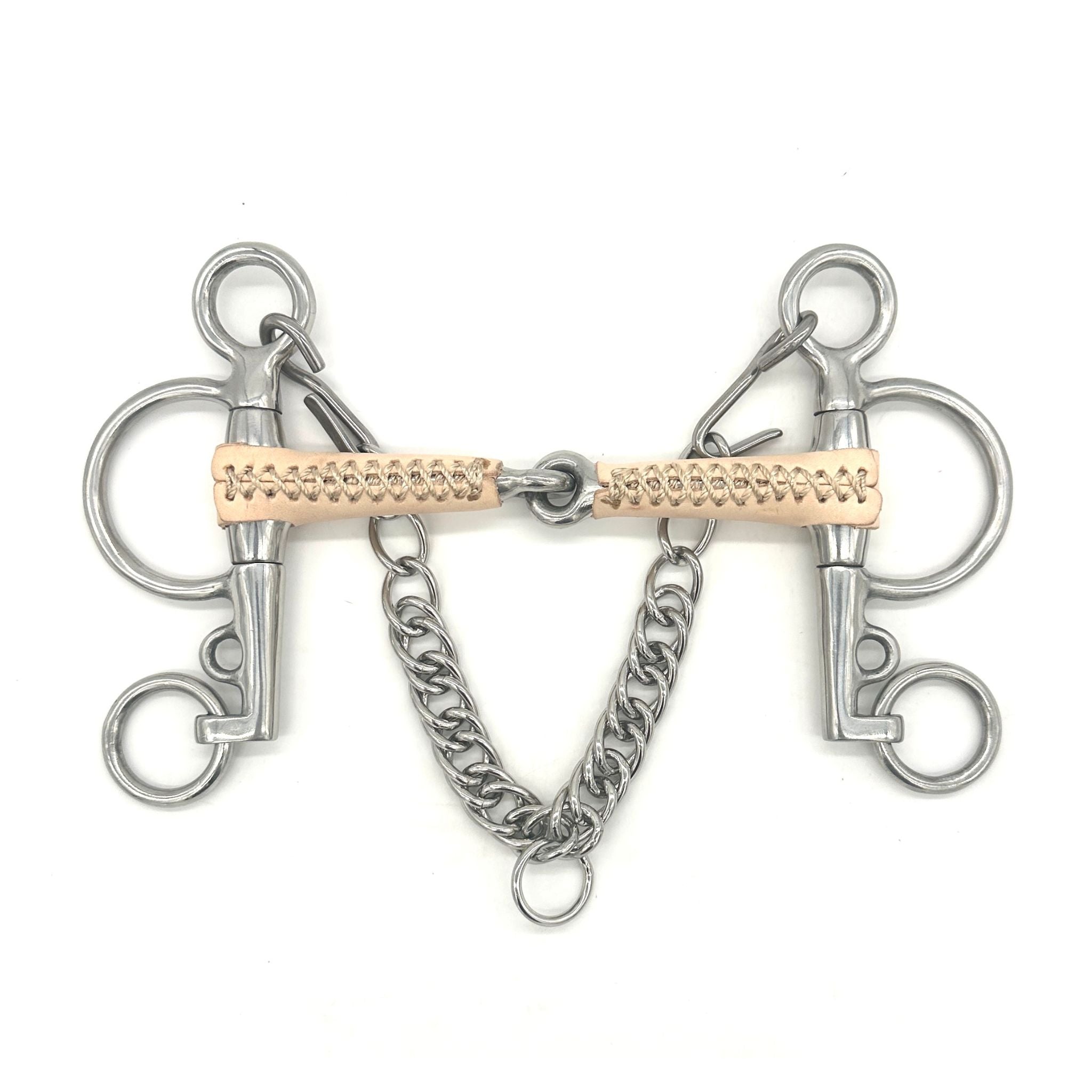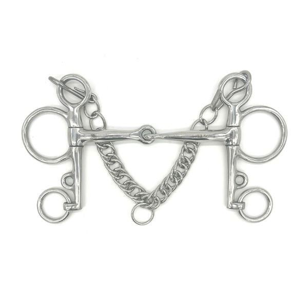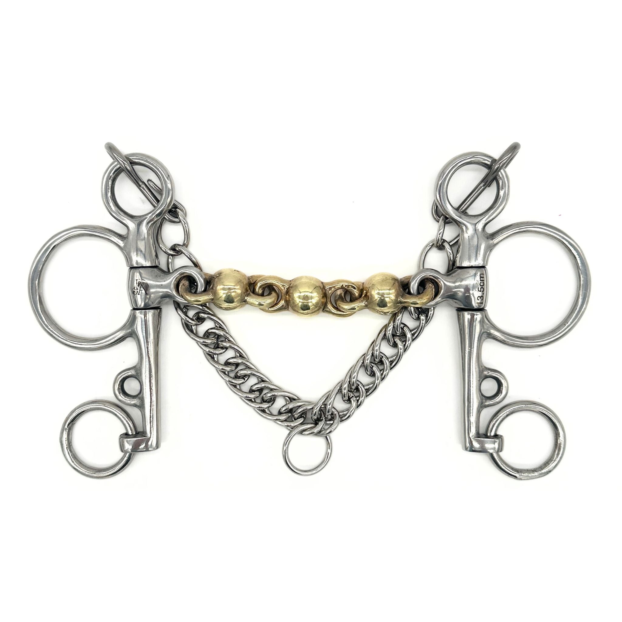 Designed for stronger horses, the Pelham allows for deeper flexion and refined control. When used with two reins, the top ring provides a softer feel, while the bottom ring offers increased leverage. A connecting strap (bridge) can also be used for single-rein use.