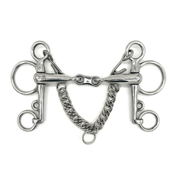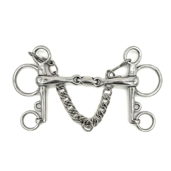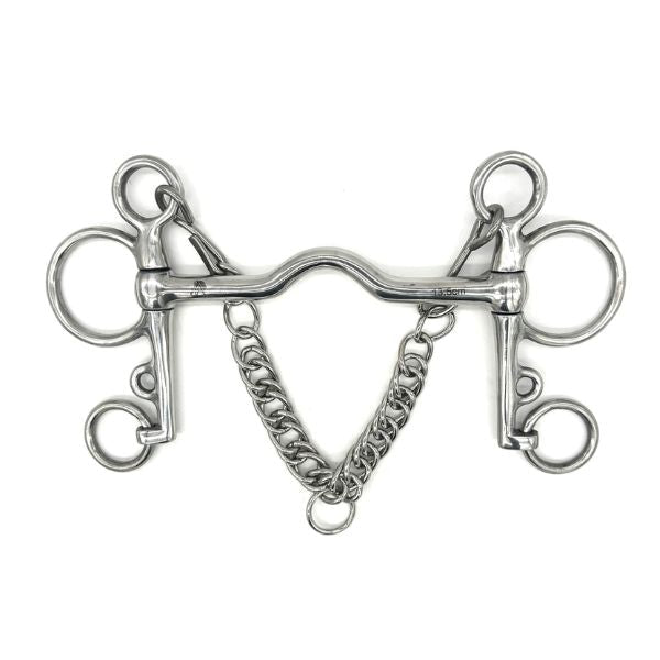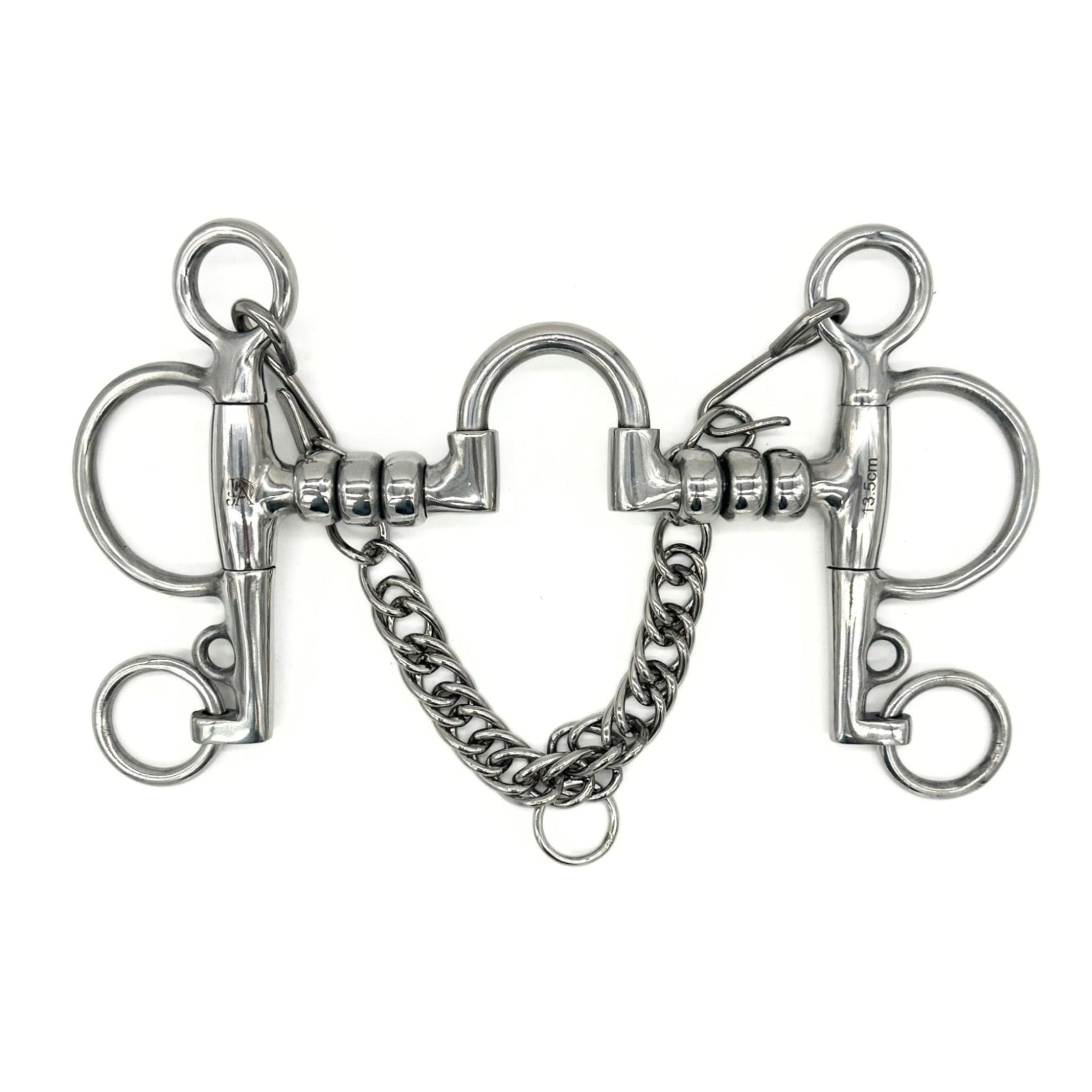 Designed for stronger horses, the Pelham allows for deeper flexion and refined control. When used with two reins, the top ring provides a softer feel, while the bottom ring offers increased leverage. A connecting strap (bridge) can also be used for single-rein use.