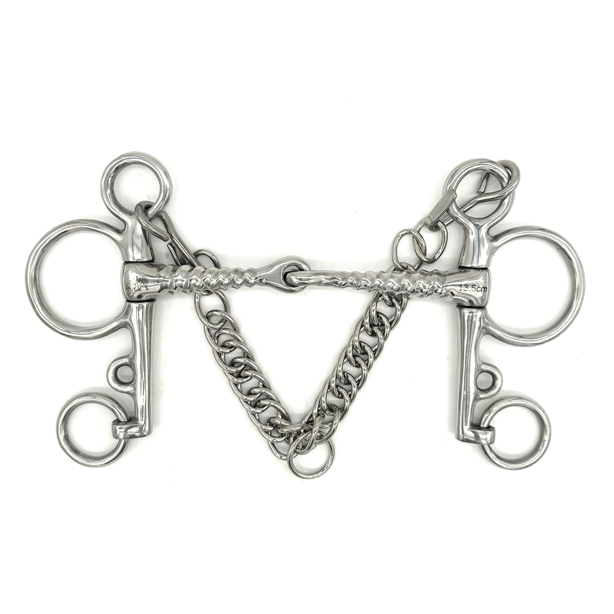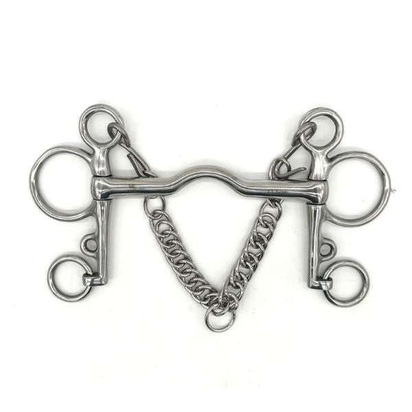Designed for stronger horses, the Pelham allows for deeper flexion and refined control. When used with two reins, the top ring provides a softer feel, while the bottom ring offers increased leverage. A connecting strap (bridge) can also be used for single-rein use.