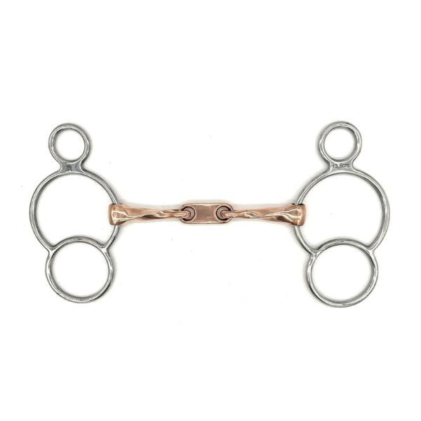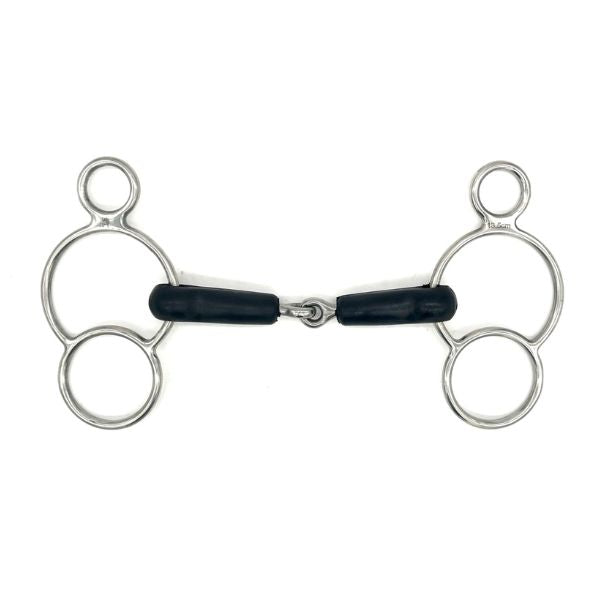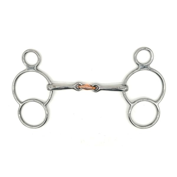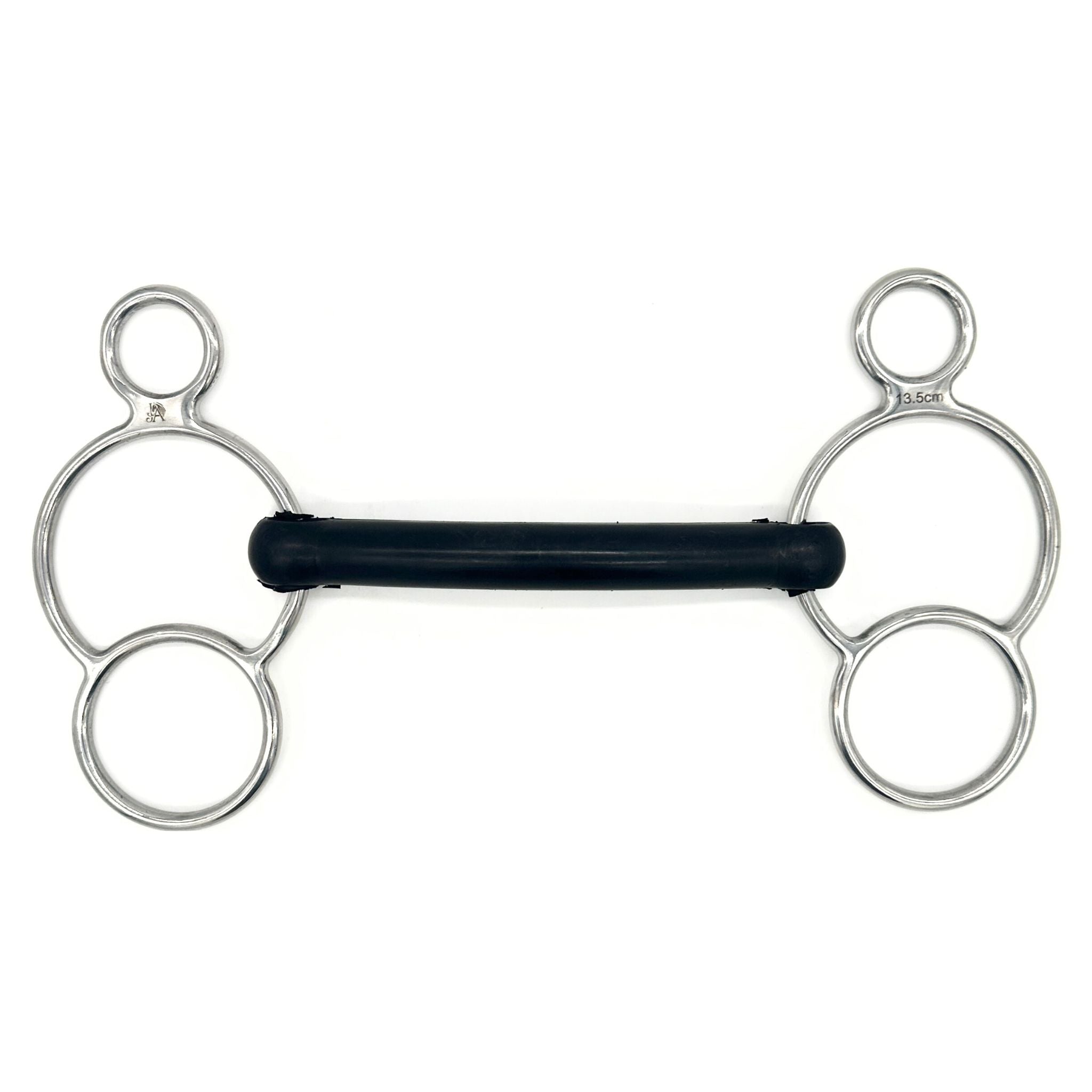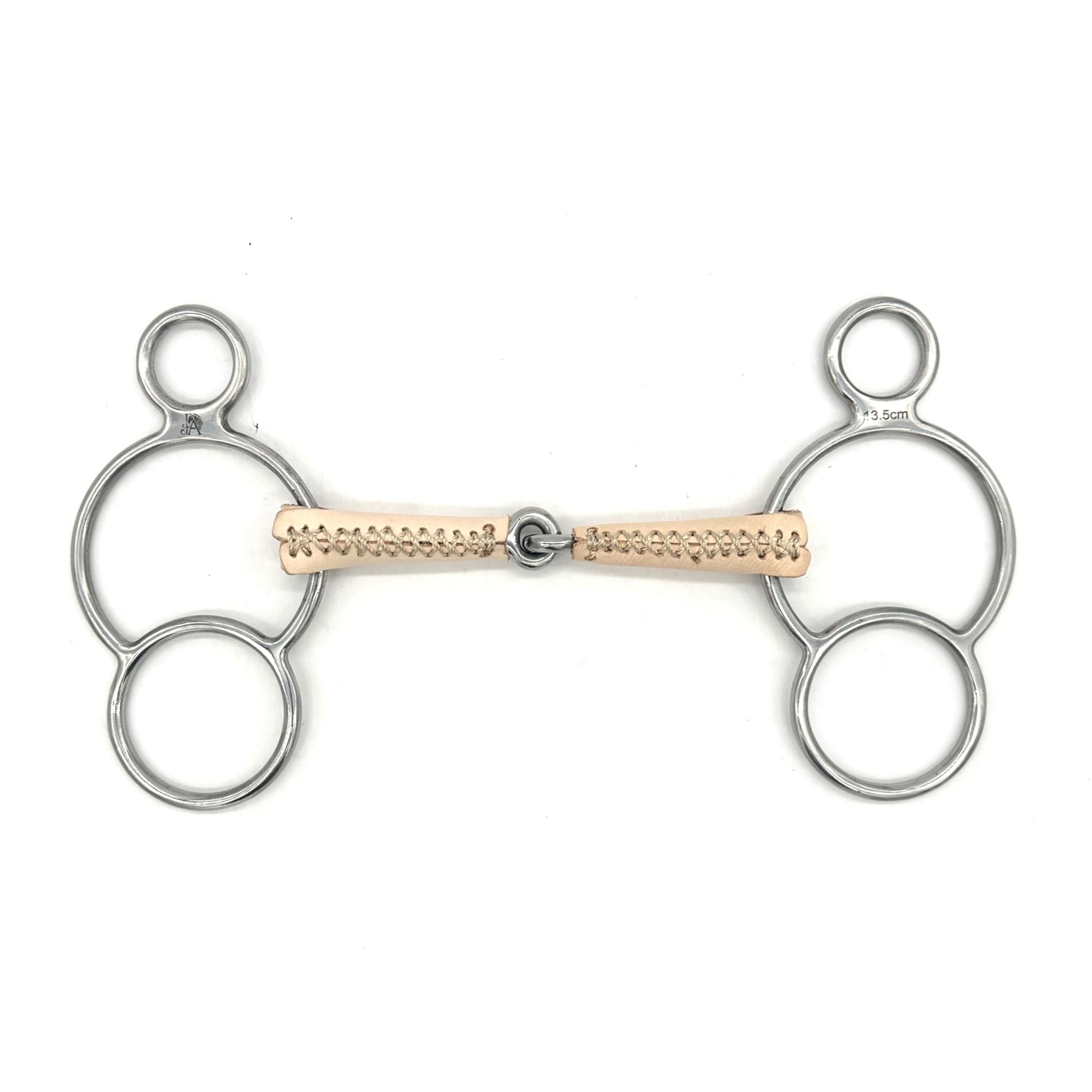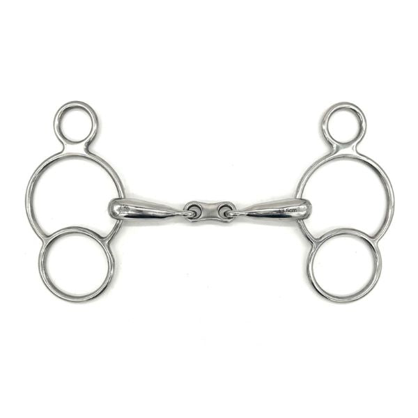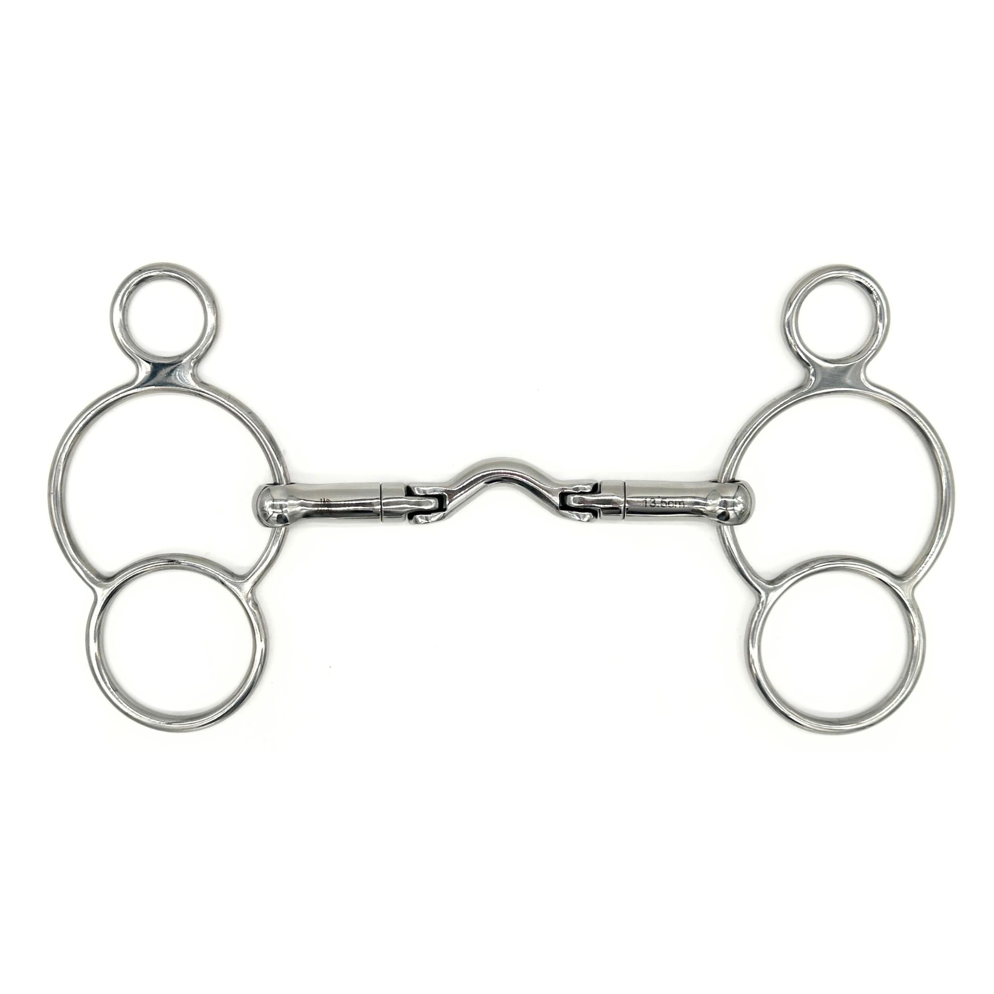 The Two-Ring Bit, commonly known as a Pessoa Bit, is easily recognized by its additional rings above and below the main bit rings. The top ring attaches to the cheekpiece, while the bottom ring is used for rein attachment. When pressure is applied to the rein, the top ring tilts forward, creating leverage for increased control.
