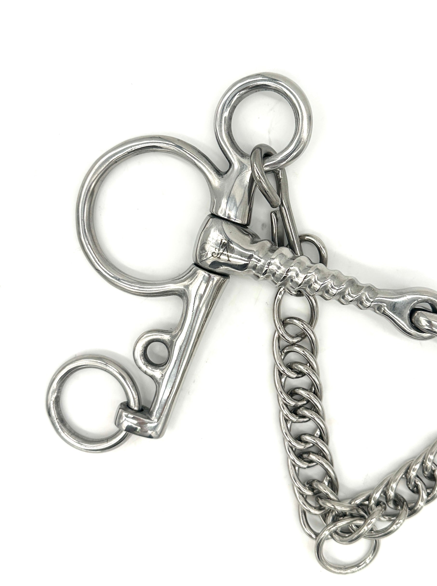 The Corkscrew Pelham Bit combines a corkscrew-textured mouthpiece with a Pelham design for increased leverage and control, making it suitable for strong horses that may need more guidance. The corkscrew mouthpiece provides concentrated pressure while the Pelham’s shanks offer adjustable rein options for varying levels of leverage.