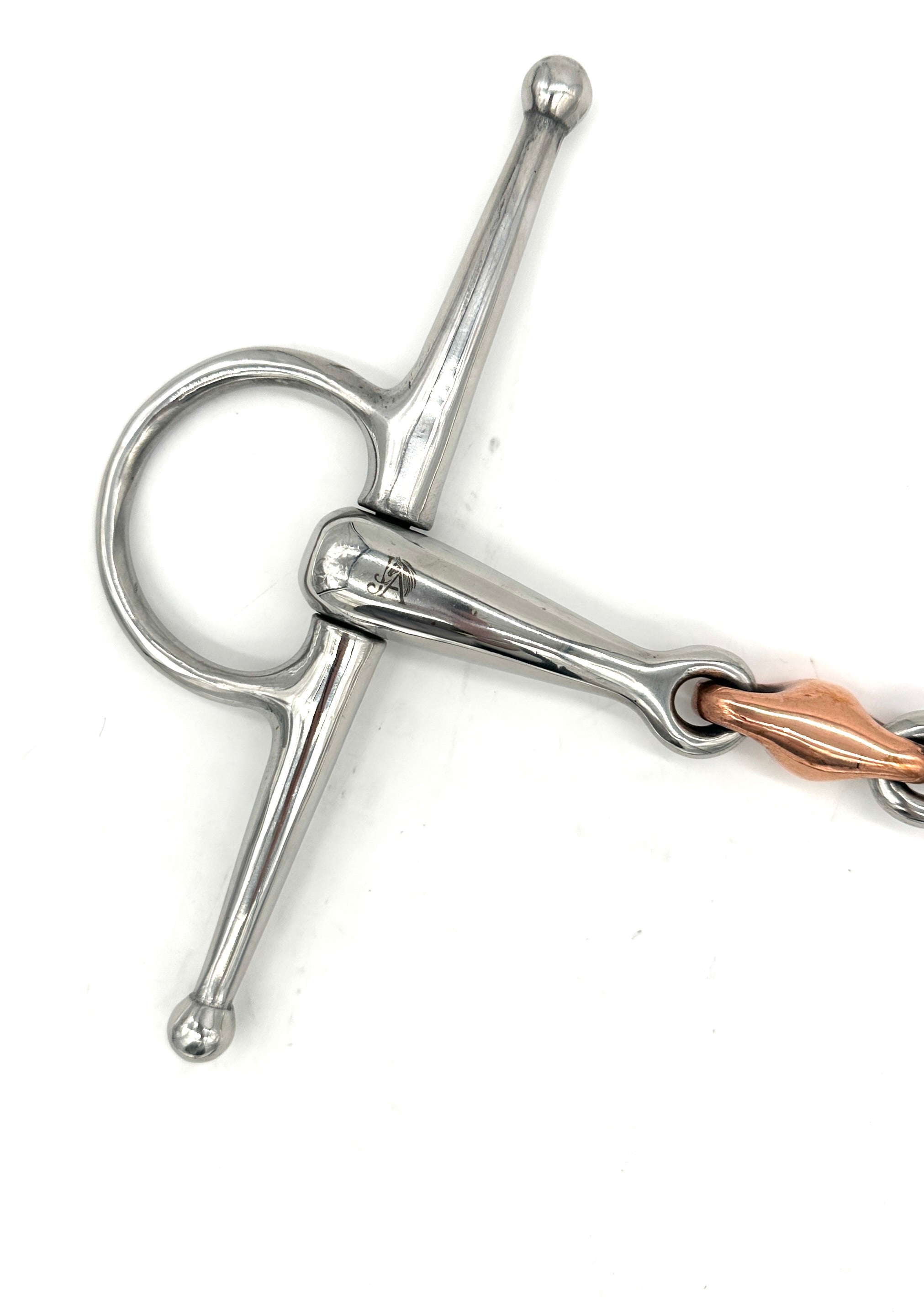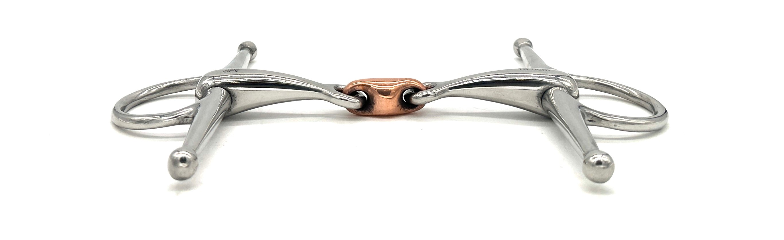 The Double Jointed Copper Elliptical Full Cheek Bit is designed to improve communication between horse and rider by combining a double-jointed mouthpiece with full cheek sidepieces. The elliptical link in the center provides even pressure distribution across the tongue and bars, reducing the “nutcracker” effect associated with single-jointed bits. The copper composition encourages salivation, promoting a softer and more responsive mouth.