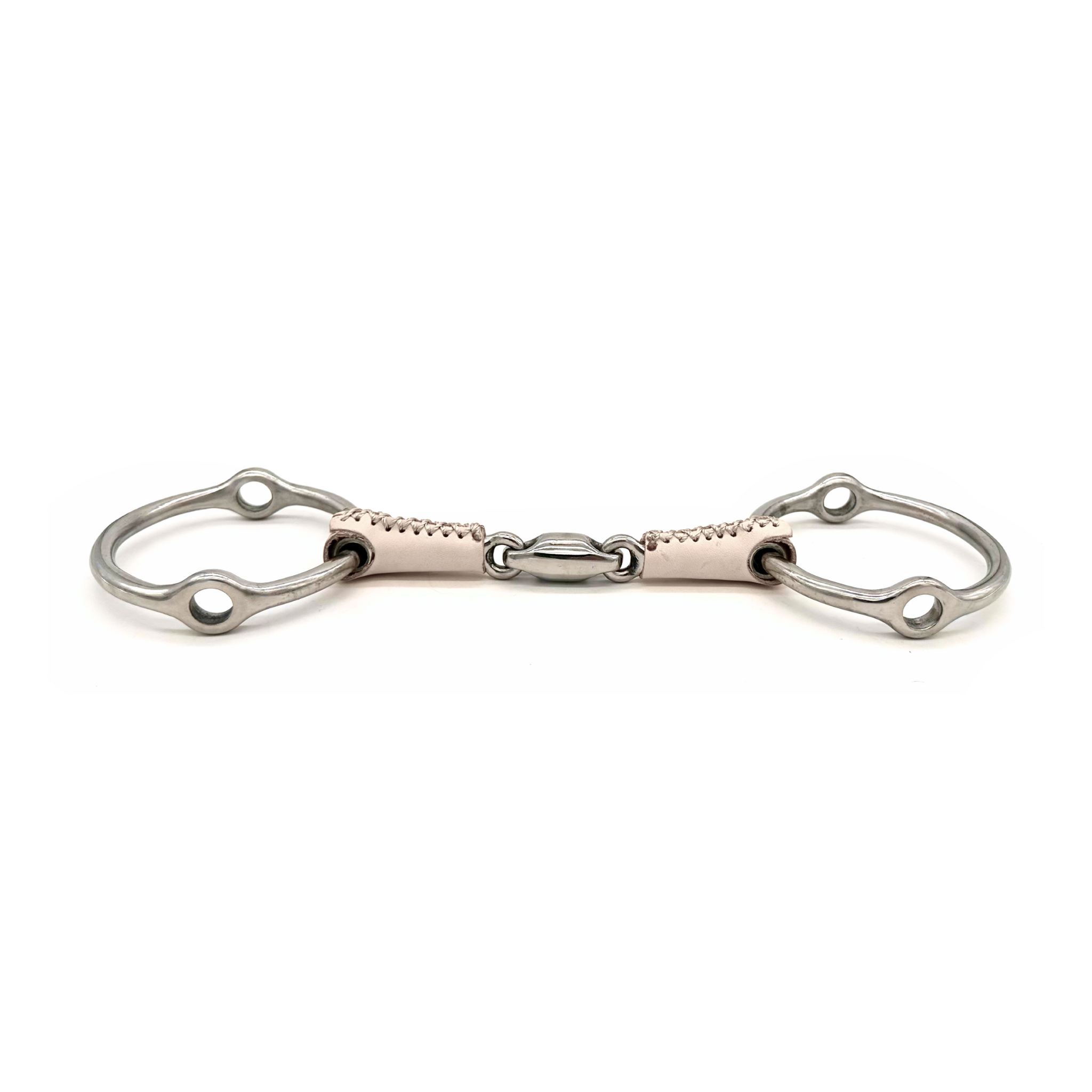 The Double Jointed Leather Covered Loose Ring Gag Bit has a stainless steel core wrapped in leather, providing strength while offering a softer surface than a bare metal bit. The leather softens slightly when moistened, giving a gentler surface for horses with sensitive mouths. Flat, non-abrasive stitching keeps the mouthpiece smooth, reducing the risk of irritation. The loose ring gag cheekpieces allow smooth rein movement, providing controlled lift while letting the mouthpiece move freely. The double-jointed mouthpiece has a central link that distributes pressure evenly and reduces the nutcracker effect. Ideal for horses that benefit from a mobile gag bit with a softer, leather covered mouthpiece.