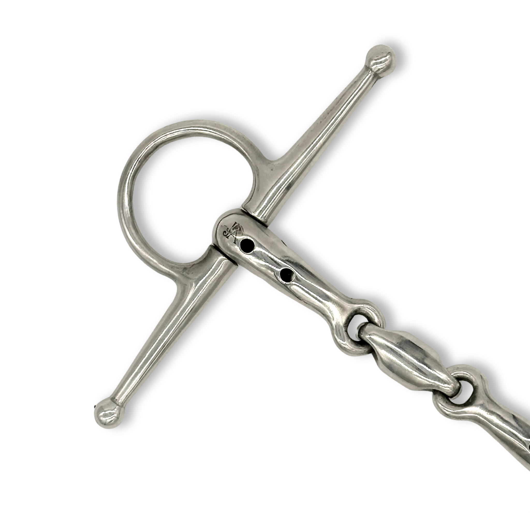 The Double Jointed Whistle Mouth Full Cheek Bit combines the moisture promoting whistle mouthpiece with the flexibility of a double joint and the lateral stability of a full cheek design. The double joint reduces palate pressure while the full cheeks prevent the bit from sliding, providing clear and direct steering. This bit is well-suited for horses that benefit from salivation and steady lateral guidance.