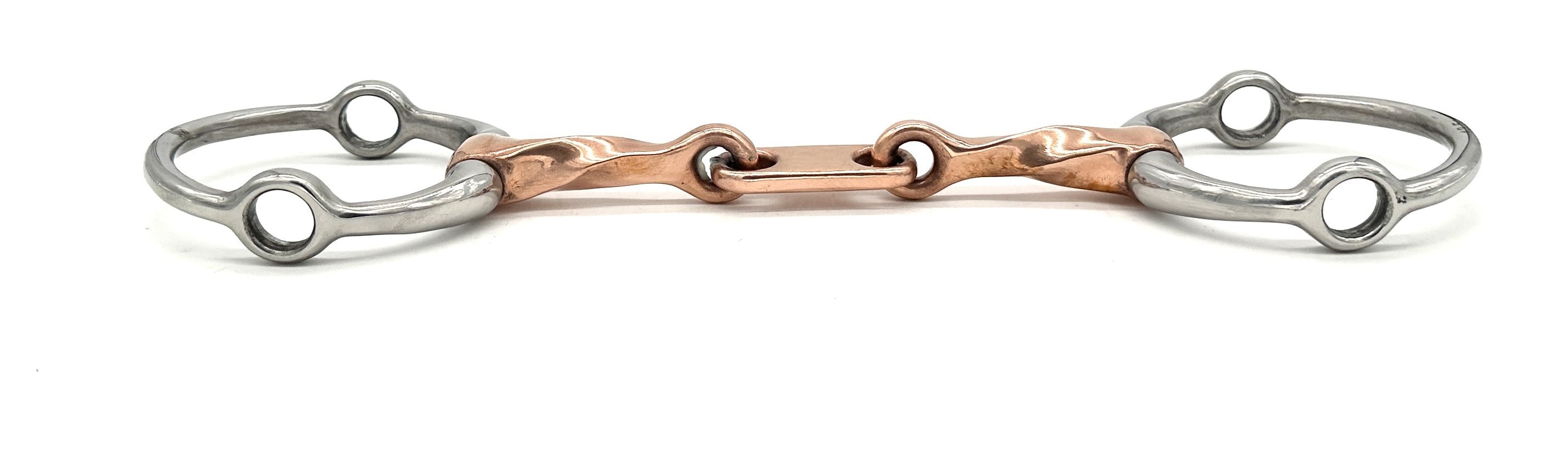 The Twisted Copper Fixed Gag with Dr. Bristol Link Bit combines a twisted copper mouthpiece for increased responsiveness with a Dr. Bristol link for even pressure distribution. The gag design offers a gentle lift, making this bit ideal for horses needing improved head carriage and refined balance.